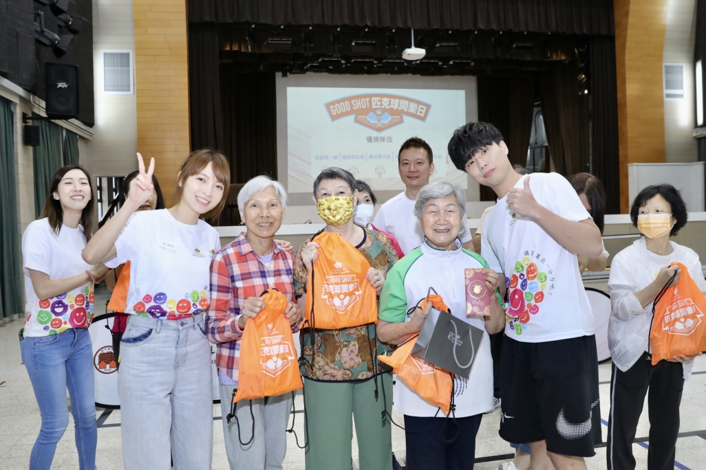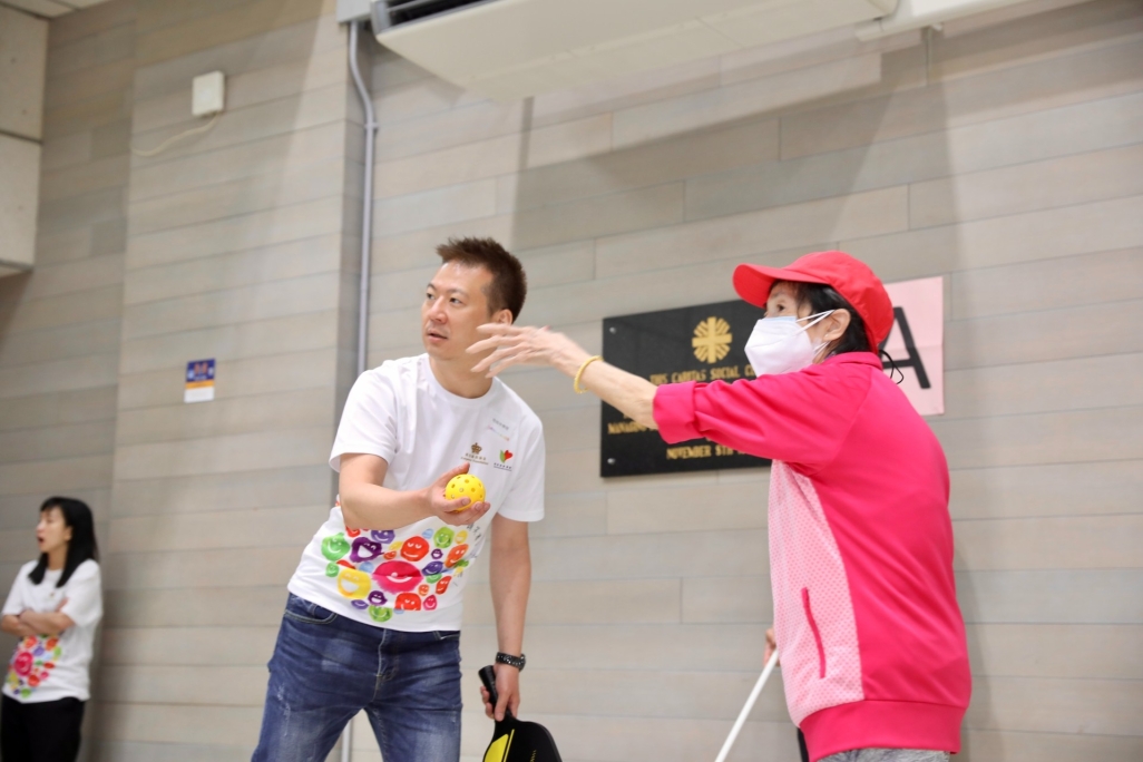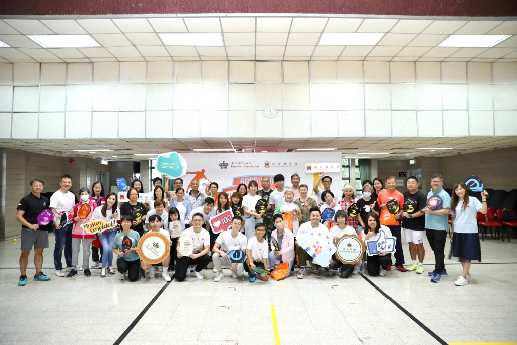 Emperor Entertainment Group’s artistes Suey Kwok and Dark Wong join the volunteers from the Group’s business units to exchange sports skills with the elderly in a friendly match
