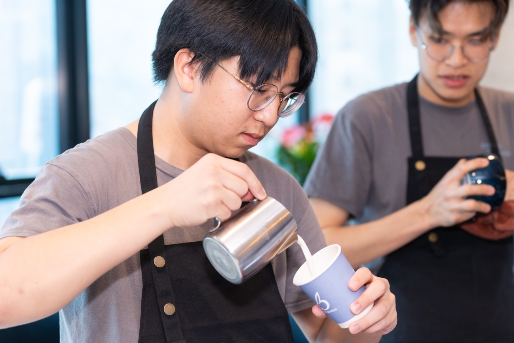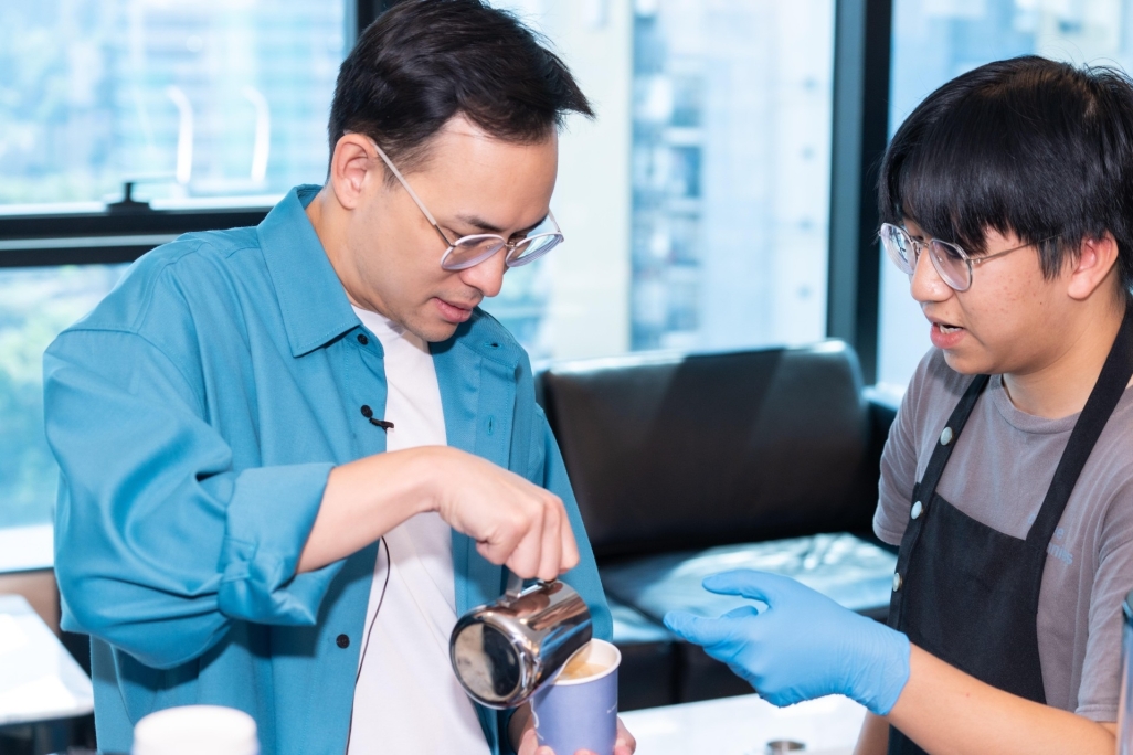 Mr. Alex Yeung, Vice Chairman of Emperor Group, receives guidance from a youth barista, learning latte art techniques, while the young barista actively shares the internship experience